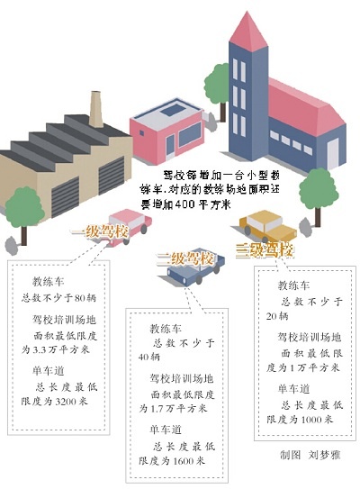 在駕校改造過程中,若要達到一級駕校標準,教練車總數(shù)不得少于80輛,二級的不少于40輛,三級的不少于20輛。不僅如此,駕校培訓場地面積也有“硬杠杠”,以小型汽車培訓為例,三個級別的駕校,其教練場地總面積最低分別得達到3.3萬㎡、1.7萬㎡、1萬㎡,單車道總長度最低限度分別為3200米、1600米和1000米。駕校每增加一臺小型教練車,對應的教練場地面積還要增加400平方米。大客、牽引車等車型的要求更高。